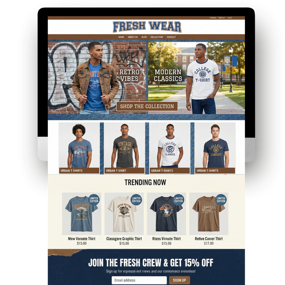Elevate your apparel brand with the Fresh Wear website template that redefines the urban aesthetic for 2026. Moving away from the typical grayscale street style, this template utilizes a sophisticated navy blue, crisp white, and earthy brown palette to deliver a urban vibe. It is the definitive e-commerce solution for t-shirt brands that prioritize quality, culture, and a clean, high-end street look.